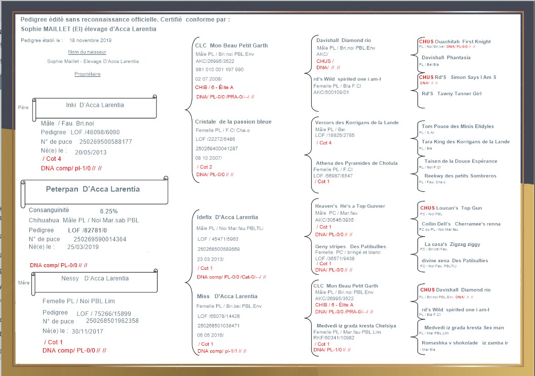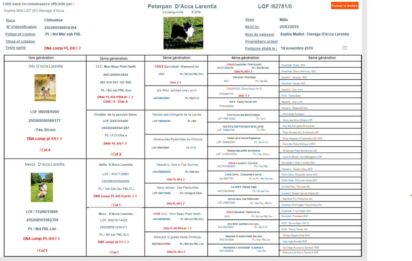 - Les versions avec pedigree affichent et permettent l'impression des pedigrees sur 3-4 et 5 générations avec le calcul de consanguinité.